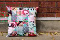 The Mystery Pillow Pattern plays with 9-patch blocks and scraps to create this fun look! Make the original pillow or an even scrappier version with smaller squares. Instructions for envelope pillow closure and zippered pillow closure are both included + a bonus quilt pattern.